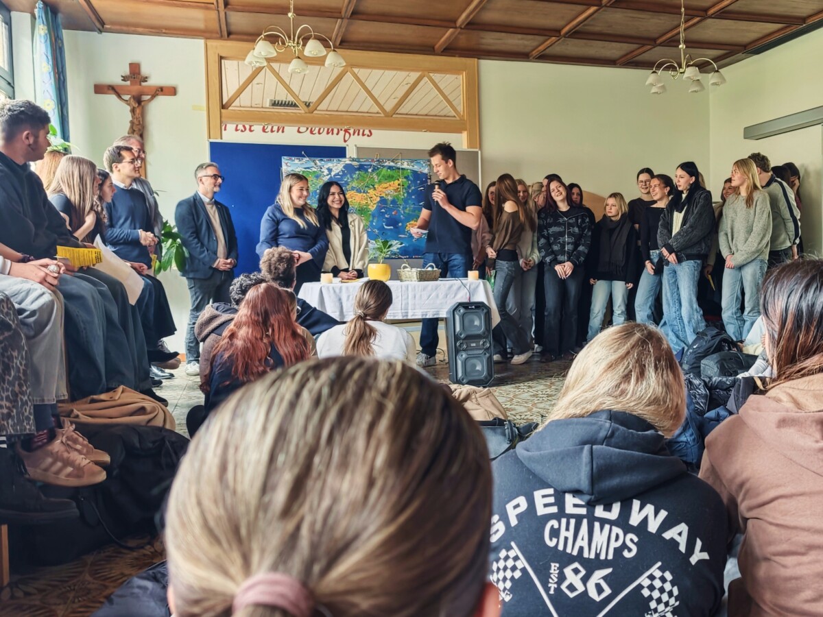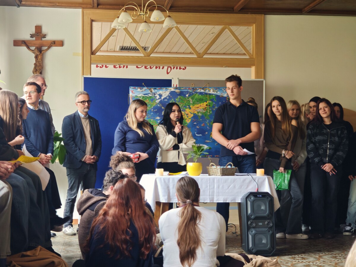 Zwar verhinderte das schlechte Wetter heuer eine Feier im Garten, aber dies tat der guten Stimmung vor den Osterferien keinen Abbruch. David Jost gestaltete den spirituellen Teil der vorösterlichen Feier wunderbar mit Anregungen aus christlicher Sicht zum Motto „Verbunden sein über Grenzen hinweg“ – wie können wir Zeichen der Hoffnung und Verbundenheit setzen, um dem Traum von einer besseren Welt einen Schritt näherzukommen? Eine Antwort unserer Schule darauf soll dieses Fastenprojekt für Syrien sein.