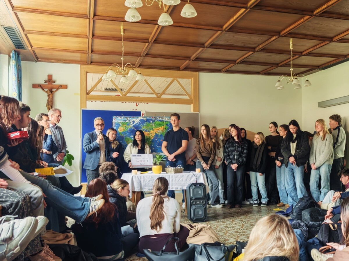 Doch nicht nur die 3HL war beteiligt – die gesamte Schulgemeinschaft zeigte große Solidarität. Viele Klassen und Einzelpersonen starteten eigene kleine Initiativen und beteiligten sich tatkräftig am Spendenlauf sowie an der Pfandflaschenaktion. Dieses gemeinsame Engagement machte das Fastenprojekt zu einem besonderen Zeichen des Zusammenhalts, und es konnte eine phänomenale Spendensumme von € 6.227,37 an die Caritas Salzburg übergeben werden. Den Spendenbetrag nahm Mag. Kurt Sonneck, Direktor der Caritas, im Rahmen des vorösterlichen Gottesdienstes entgegen.